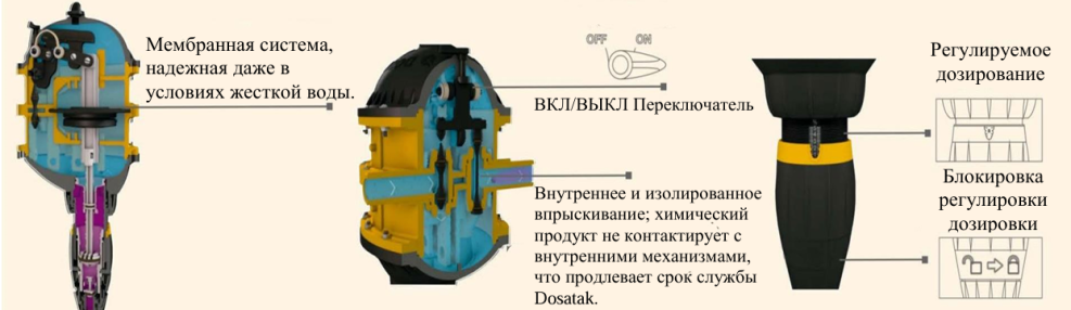 Автоматическое и точное дозирование с контролем концентрации вещества даже при колебаниях потока и давления в системе, без необходимости использования электроэнергии.